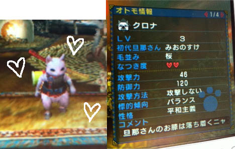 上位火山に行けるようになり、コンスタントにユクモポイントを得られるようになったので(つまりポイントをケチらずに、毎回ニャンタークエストにも出撃させられる)アイルーを増員しないと!と、初の女の子イメージアイルーたんいらっしゃーい!コメントは断固変更する派なので悩みました。文字数が足りなくて「旦那さんとの接し方うんぬん」が入らずw 「ボクの血は…」もアイルーとしては違うなーって思ったので、ヘヤノスミスイメージで旦那さんお膝となりました。毎日抱っこいっぱいしてあげるからね!!きゅーーん!!