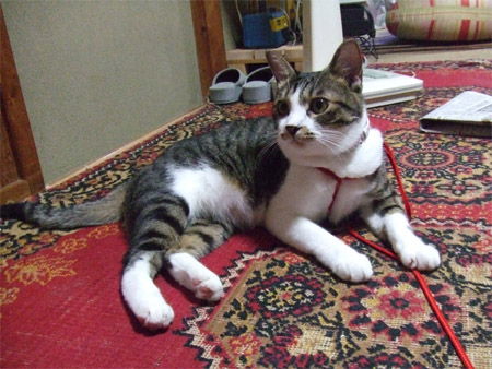 モモちゃんは毎日脱走するので、家の中にいるときも紐をつけられてしまいました。紐があるとないとでは捕まえやすさが段違いだからだそうです。しかしわたくしめ「危ないやん… 木の枝とかにからんで首吊ったりしたらどうすんの…」と提言したところ、即座に取り外されましたとさ。