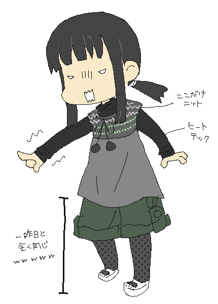 うっかりと正直な服装を二日連続で絵に描いてしまったため、こんな話までする羽目に。最近なんかだめだなほんと、明日も出勤だし、早目に寝ないとな…(そして寝る寝る詐欺へ…)