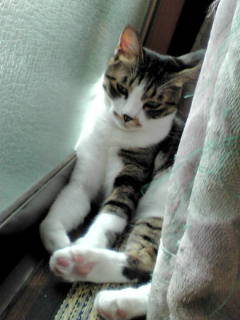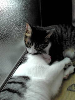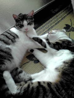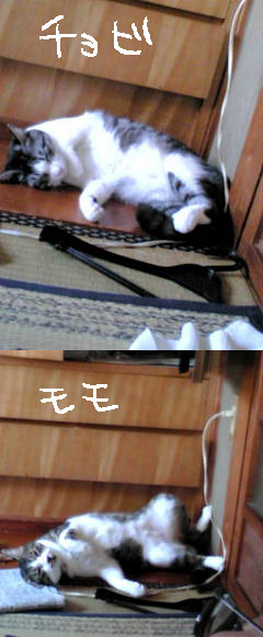 2匹ともこの場所によくいるようです。板の間が涼しいのね。猫って夏は涼しい場所、冬はあったかい場所よく知ってるよね!