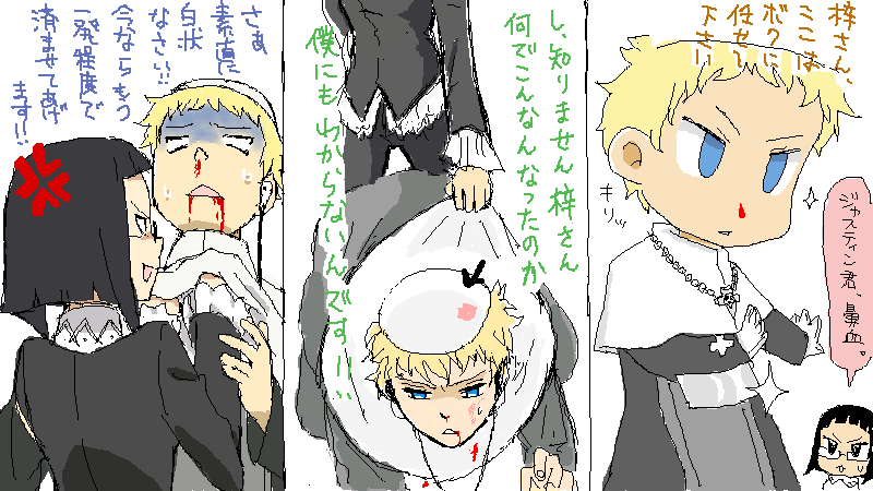 [→ とろろ様]宅のお絵描きチャットに参加させていただきました!なんとなんと私のあこがれ!![→ 志央子様]がいらっしゃったのでいきなりテンションMAX針振り切れるみおのすけ!(ツイッターではお世話になっておりましたが絵茶では初めてお会いしました!)お題はなにやら「流血ジャスティン」ということだったのですが、いざ!お二方の色っぽいジャスティンをっとこっそり期待しつつ、自分はフフフとまんじゅう的なジャスティンを描き始めてみるや、どっこい一筋縄ではいかなかった!www